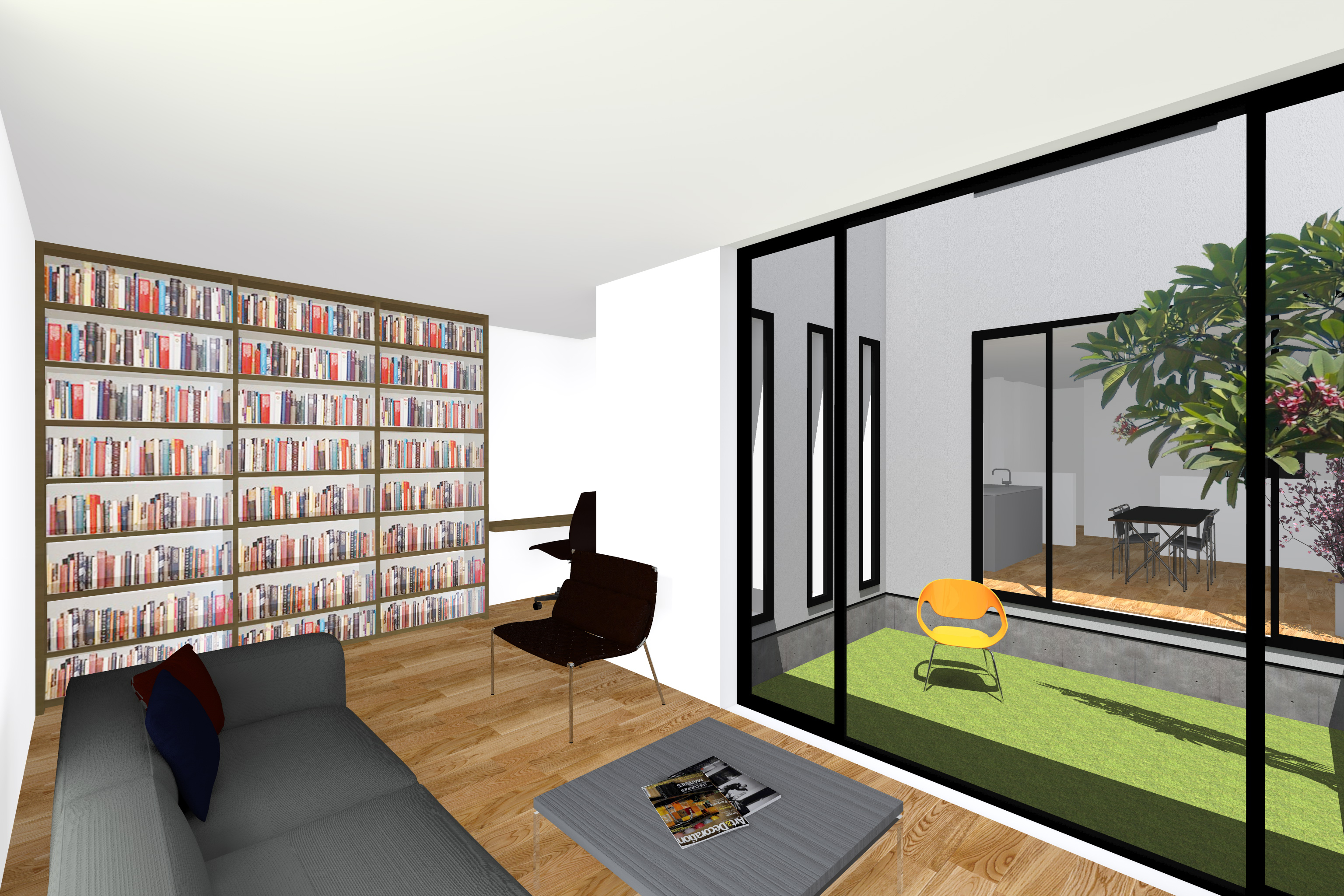 一番奥のリビングは、少し離れのように配置することで、こもれるライブラリーコーナーのような落ち着ける空間とし、お客様が泊まられる場合はこのスペースをホテルの様に使って頂くよう、各動線も整理して計画しています。