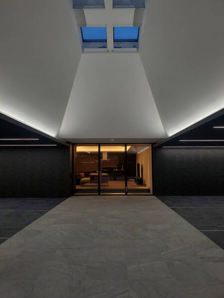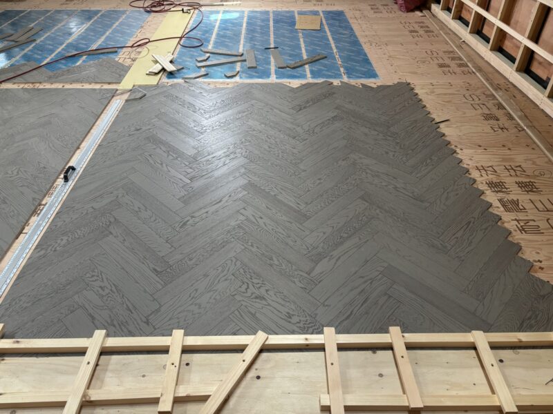 居住区には床暖房が入り、仕上げはフローリングをヘリンボーン調で納めています。