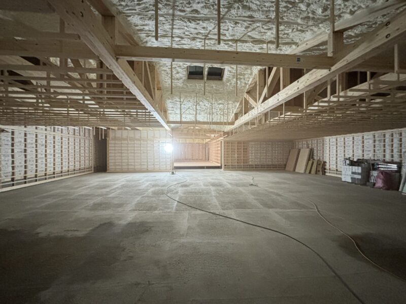 こちらの邸宅、天井の断熱材はウレタン断熱を201㎜以上、壁には105㎜のグラスウールが充填されており、
