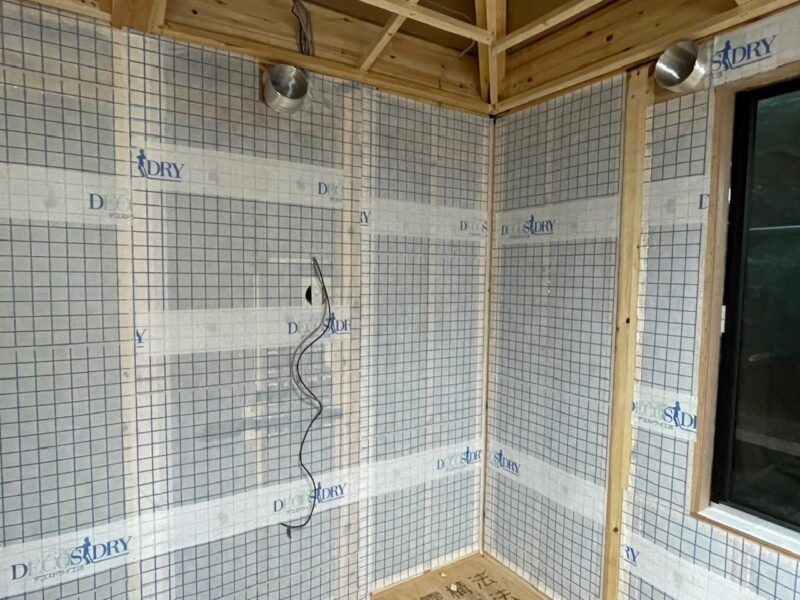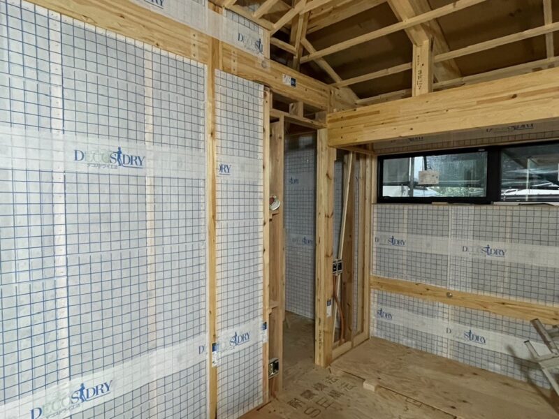 先日、無事に上棟を迎えた邸宅は、耐力壁やサッシの取付、中間検査や屋根瓦葺きを終えて、