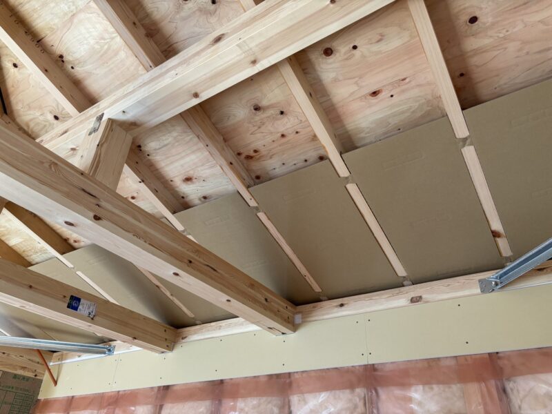 上棟後、屋根の裏側にこうしたダンボール素材の通気部材を入れて通気層を確保