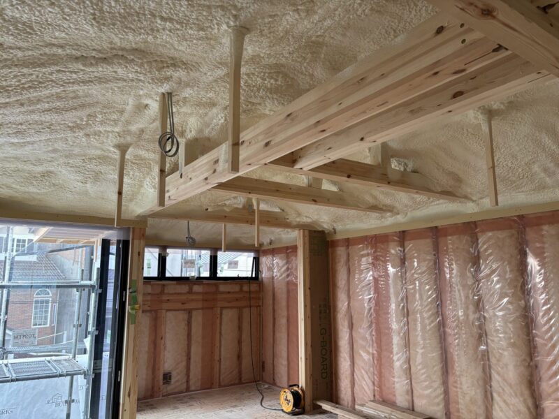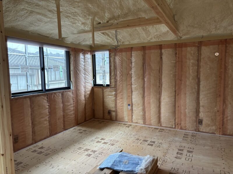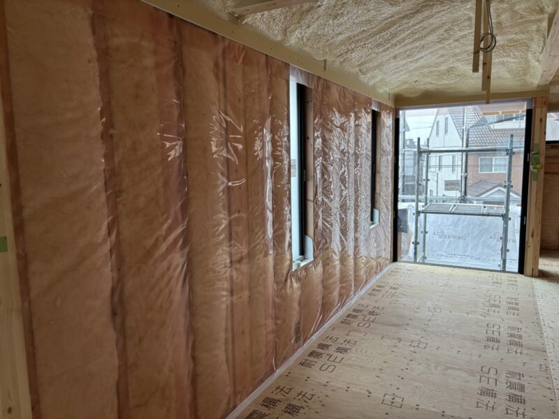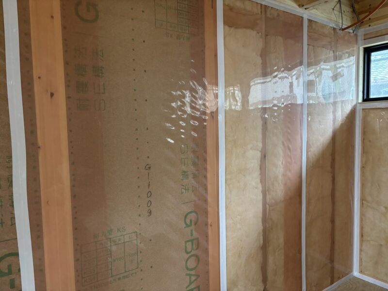 充填後に気密シートを貼っているのは気密を確保するためと、壁体内結露で断熱材が濡れてしまわない