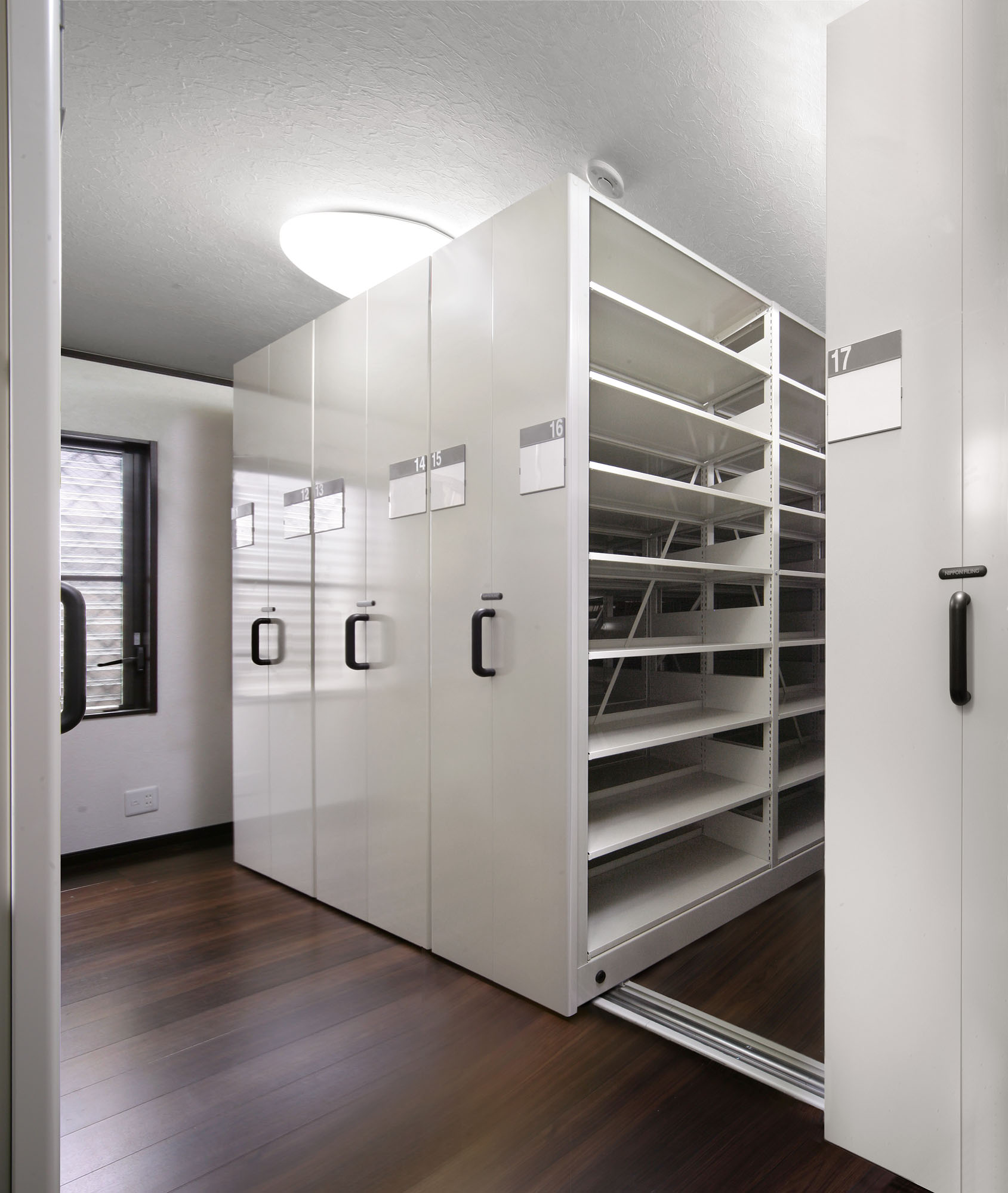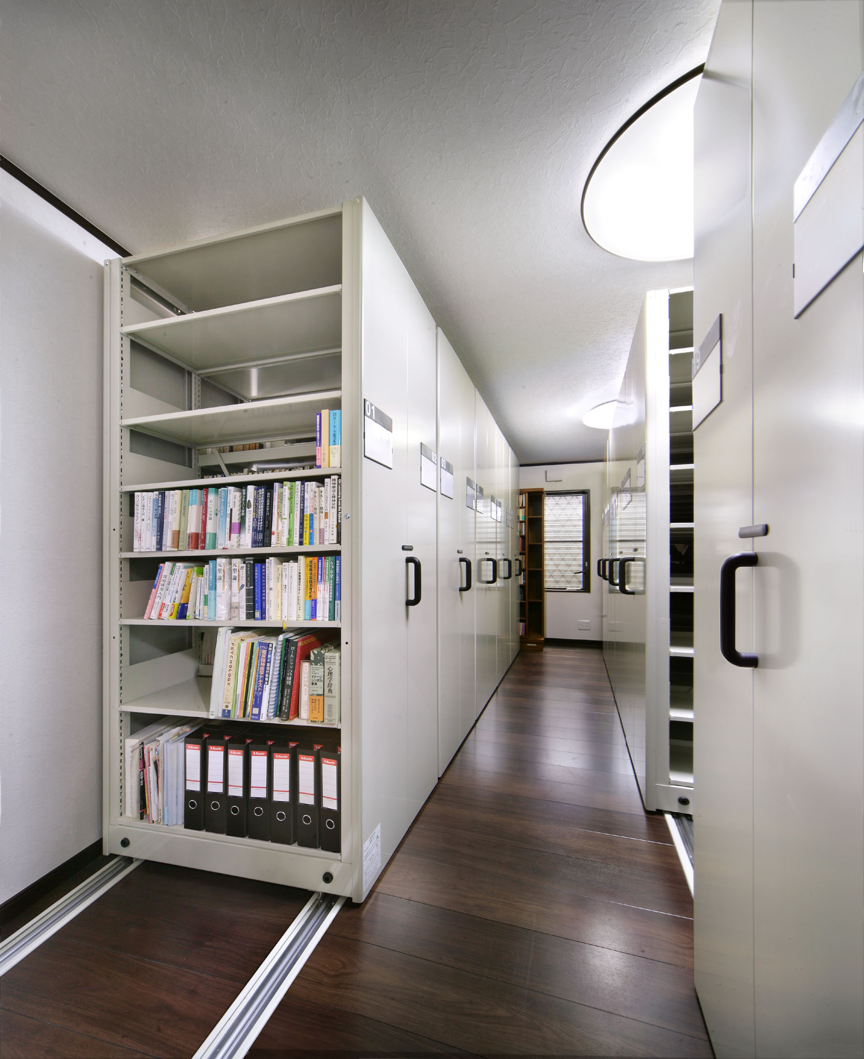写真様に、床に設置したレールの上を可動式の書庫が移動しますので、