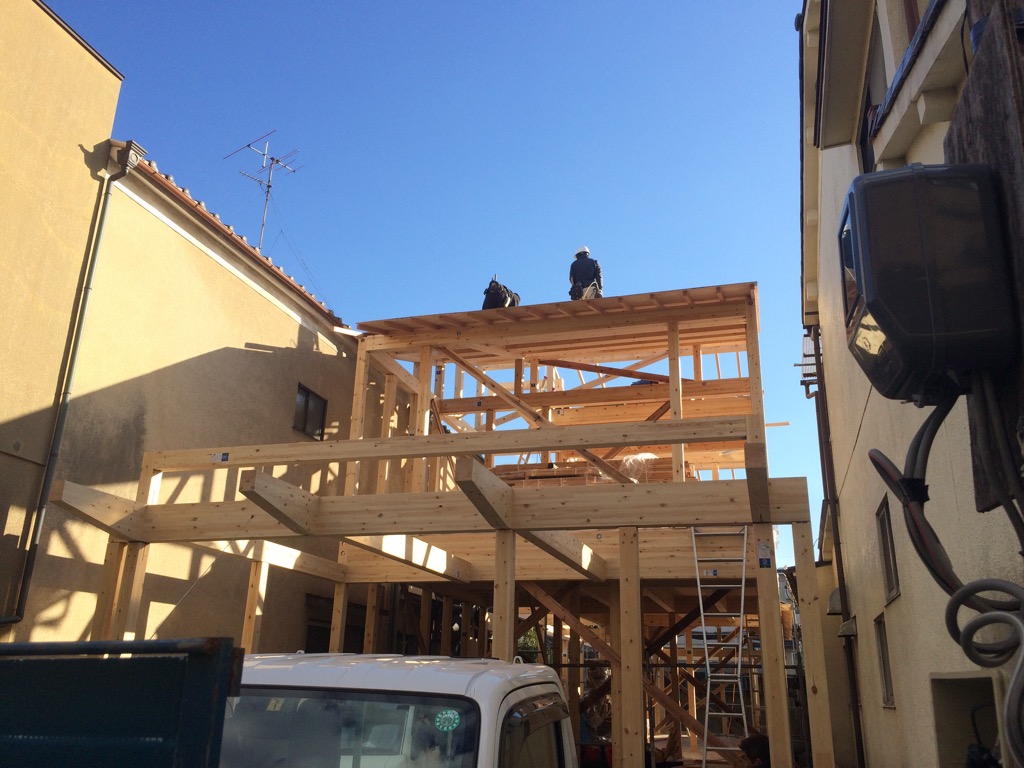 材料搬入や土地形状などを考慮して、2日に分けて上棟いたしました。