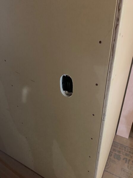 大工さんが貼った石膏ボードに、こうして電気屋さんが開口していきます。