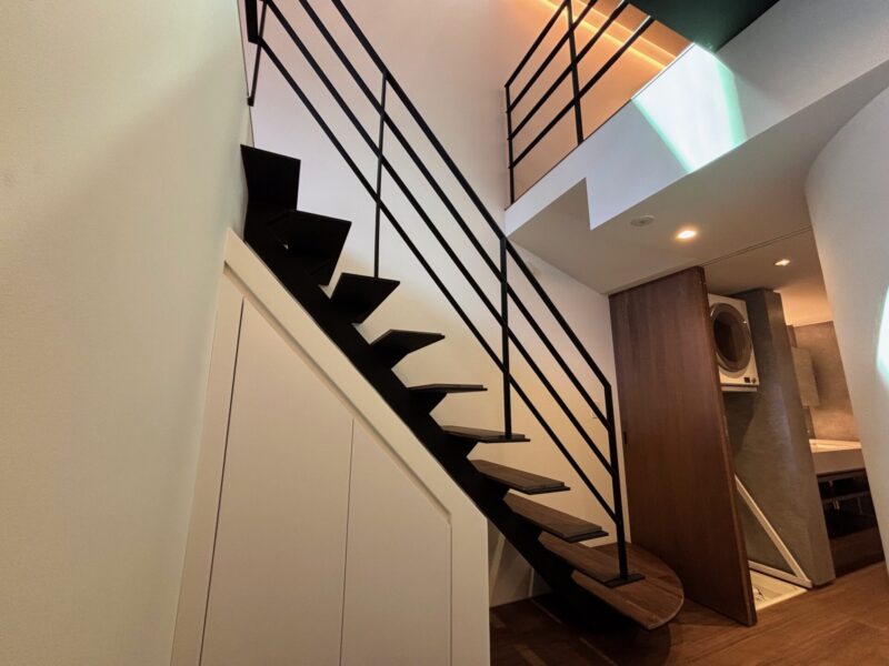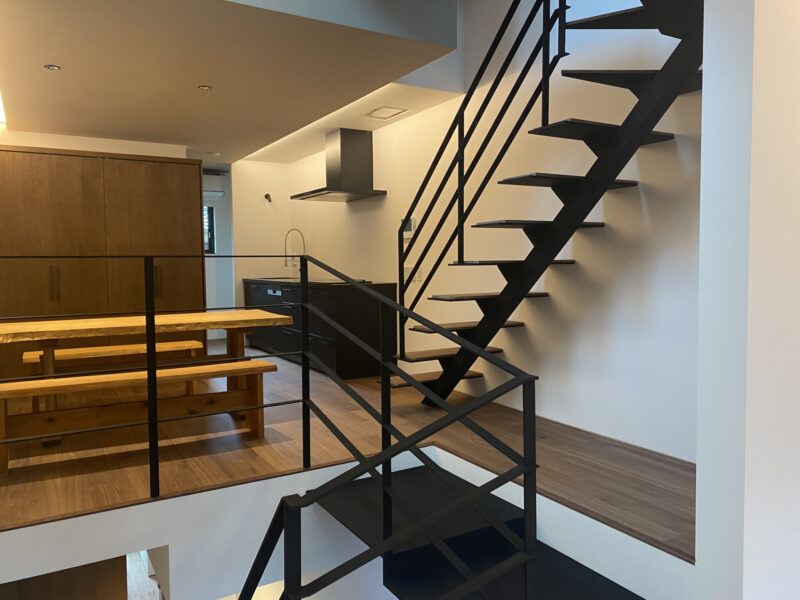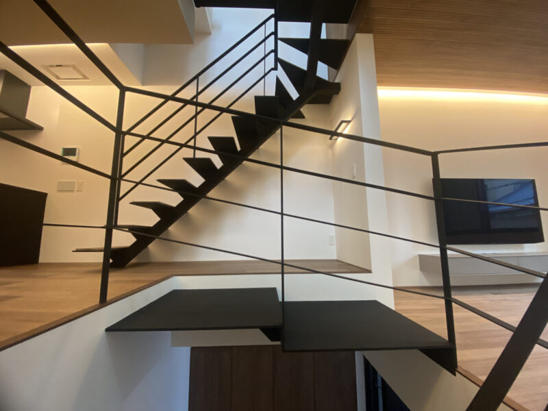 1階から3階までを貫く吹き抜けに、軽やかに掛かる階段。
