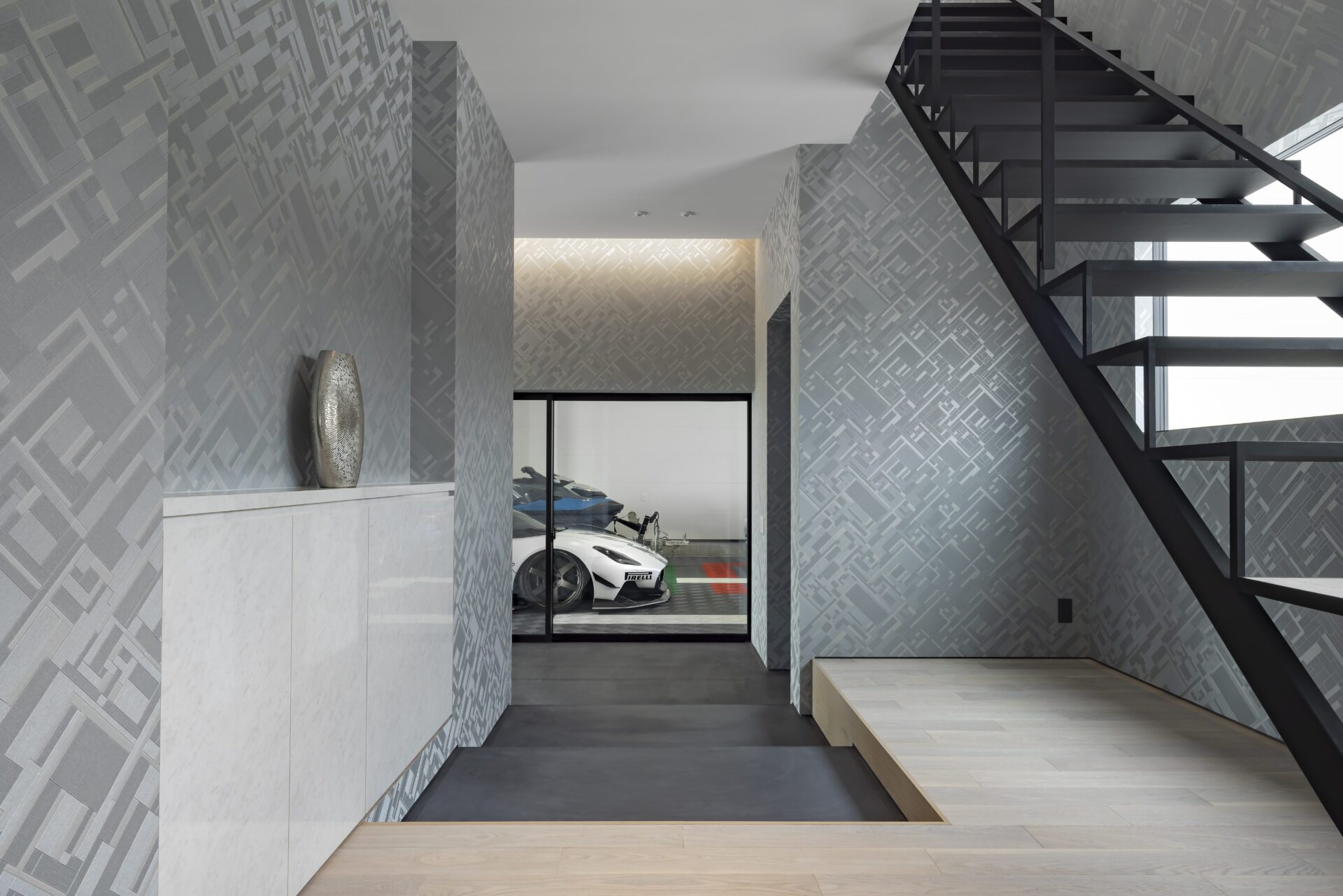 ガレージからもメインの玄関へとアクセスでき、湖畔へもつながる動線に。