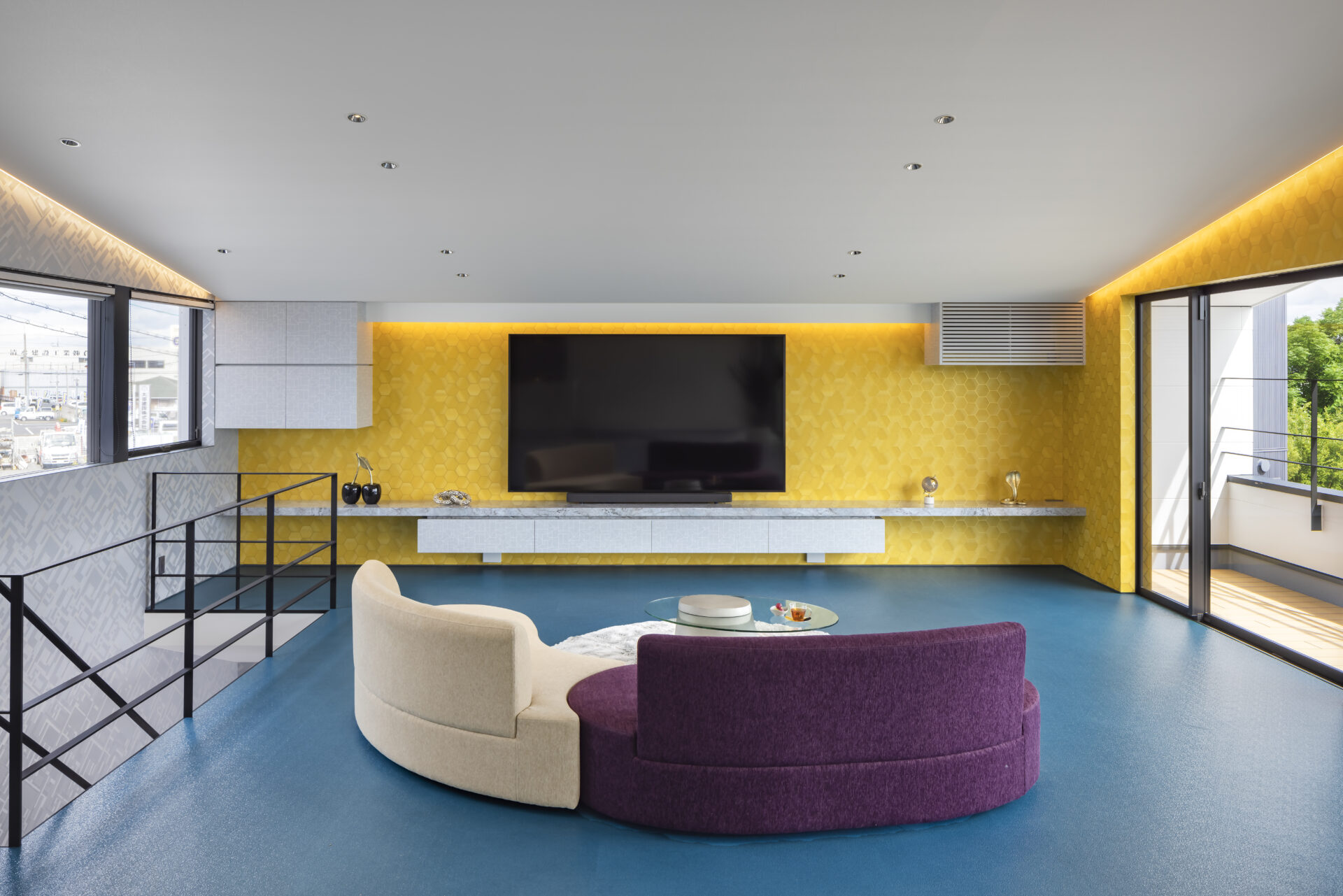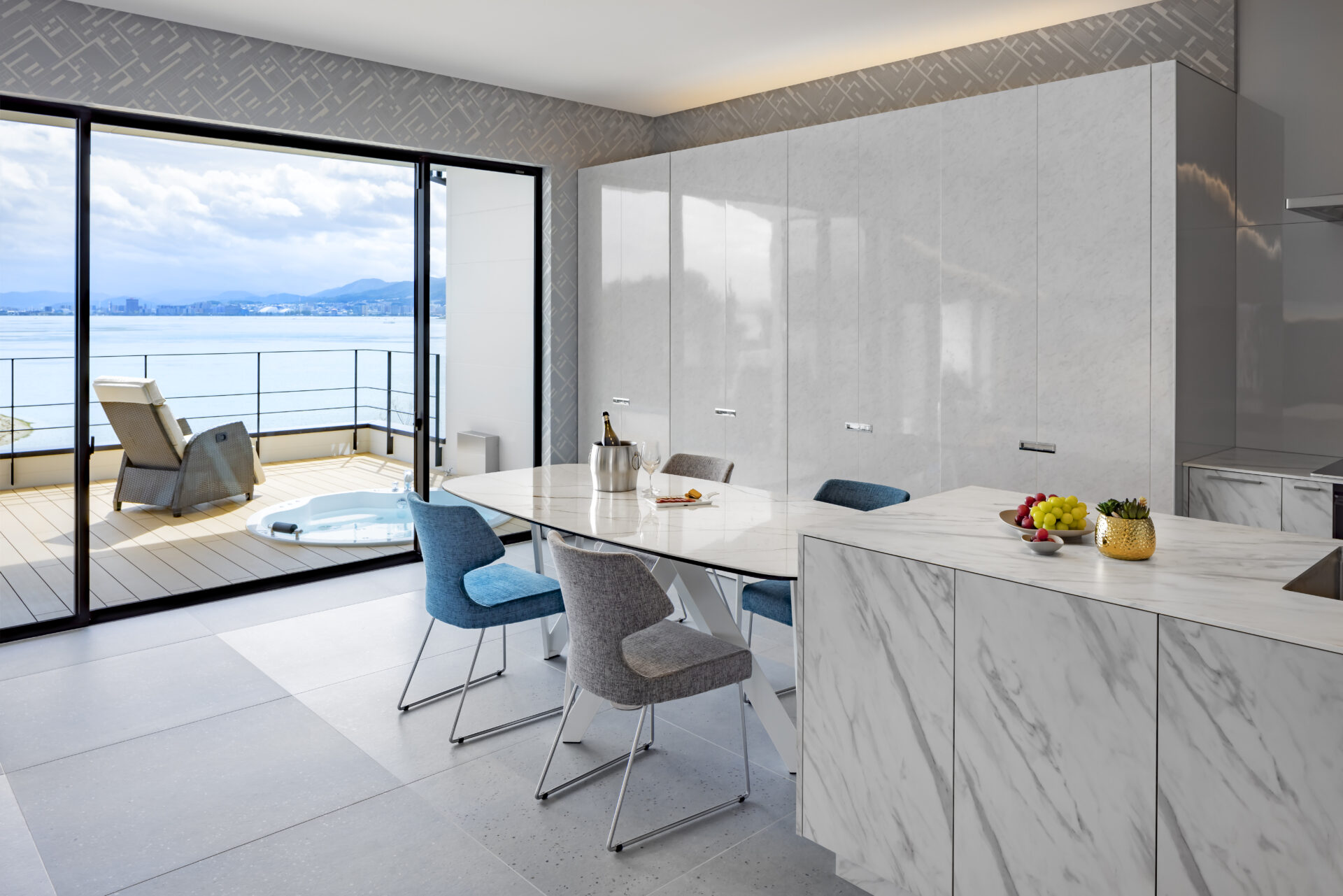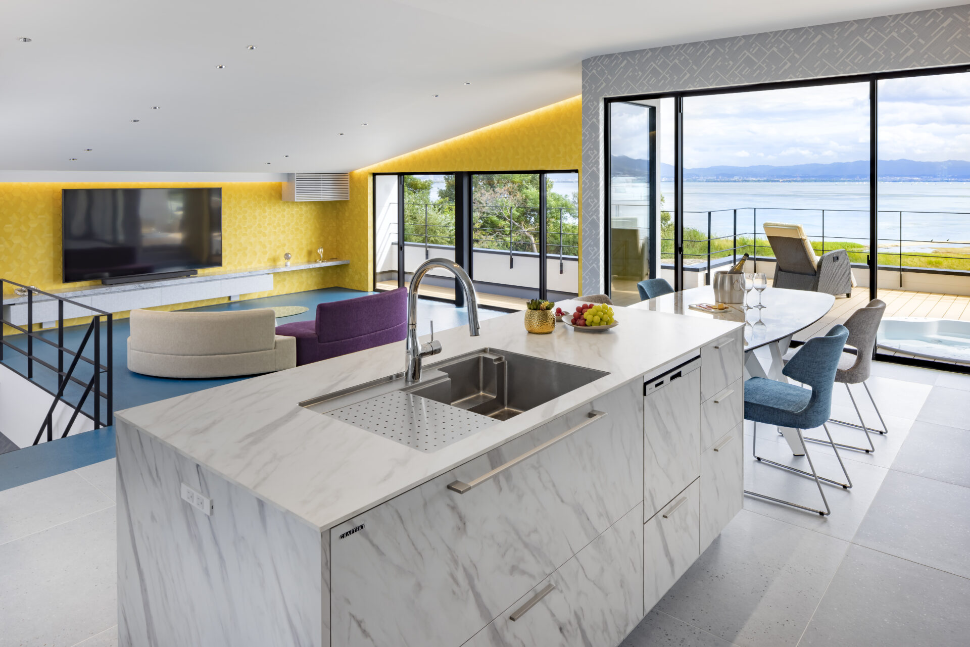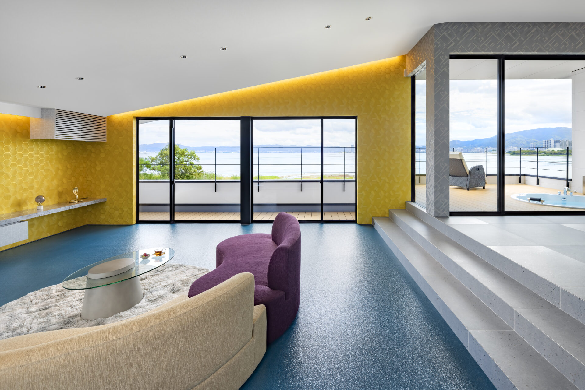 カラフルでユニークなアイテムを重ね、唯一無二の空間が完成。 雄大な琵琶湖の景色をどのアングルからも満喫できる。
