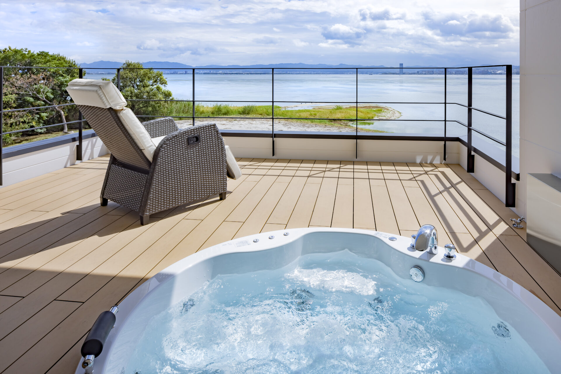 LDKとバルコニーテラスをフラットにつなげ、プライベートジャグジーを設置。
