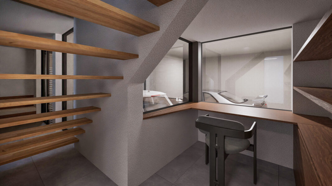 ガレージと玄関ホールをガラスで仕切ることで、愛車の存在を暮らしの風景として取り込み、車の出入りを天候に左右されず、屋内動線の延長としてスムーズにアクセスできる設計としています。