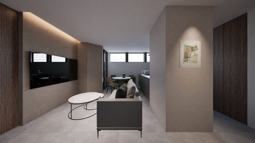 淡いグレーを基調とした2階のLDKは、素材の重なりと陰影が静かな奥行きを生み、間接照明がその表情をやわらかく際立たせます。